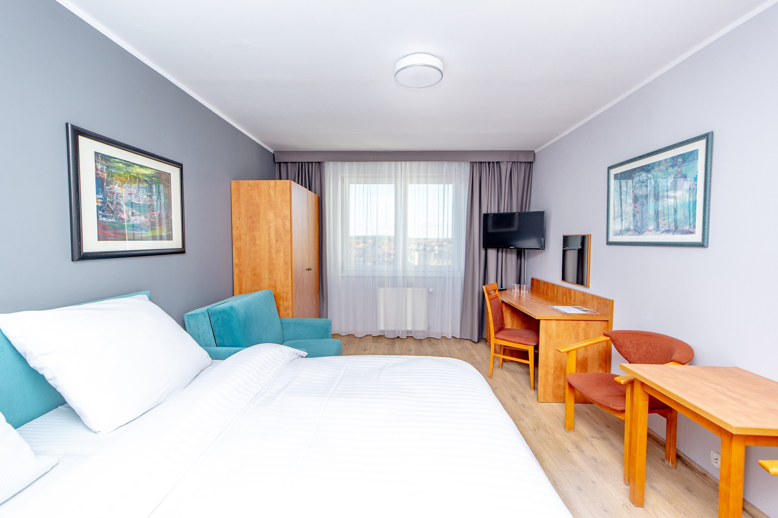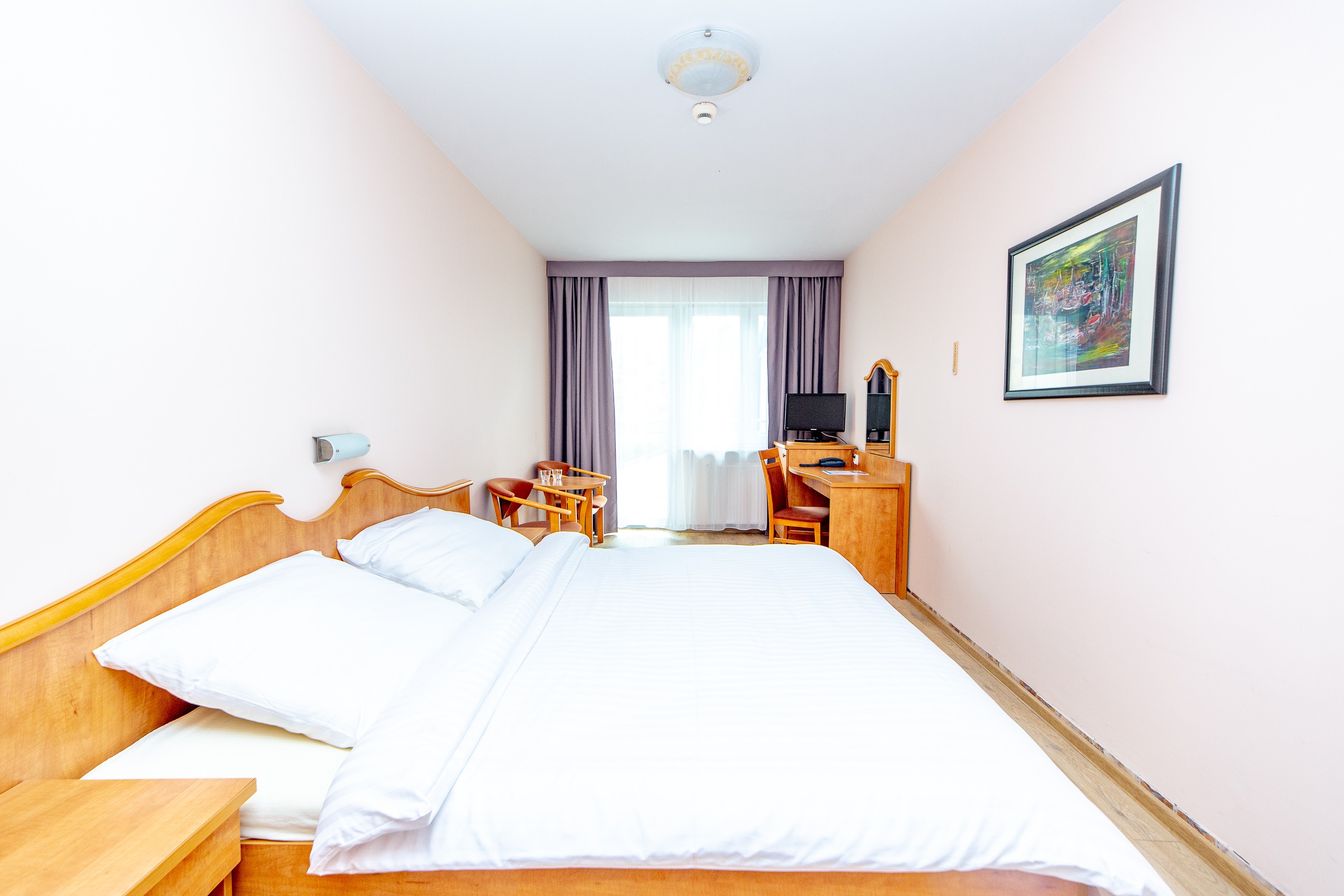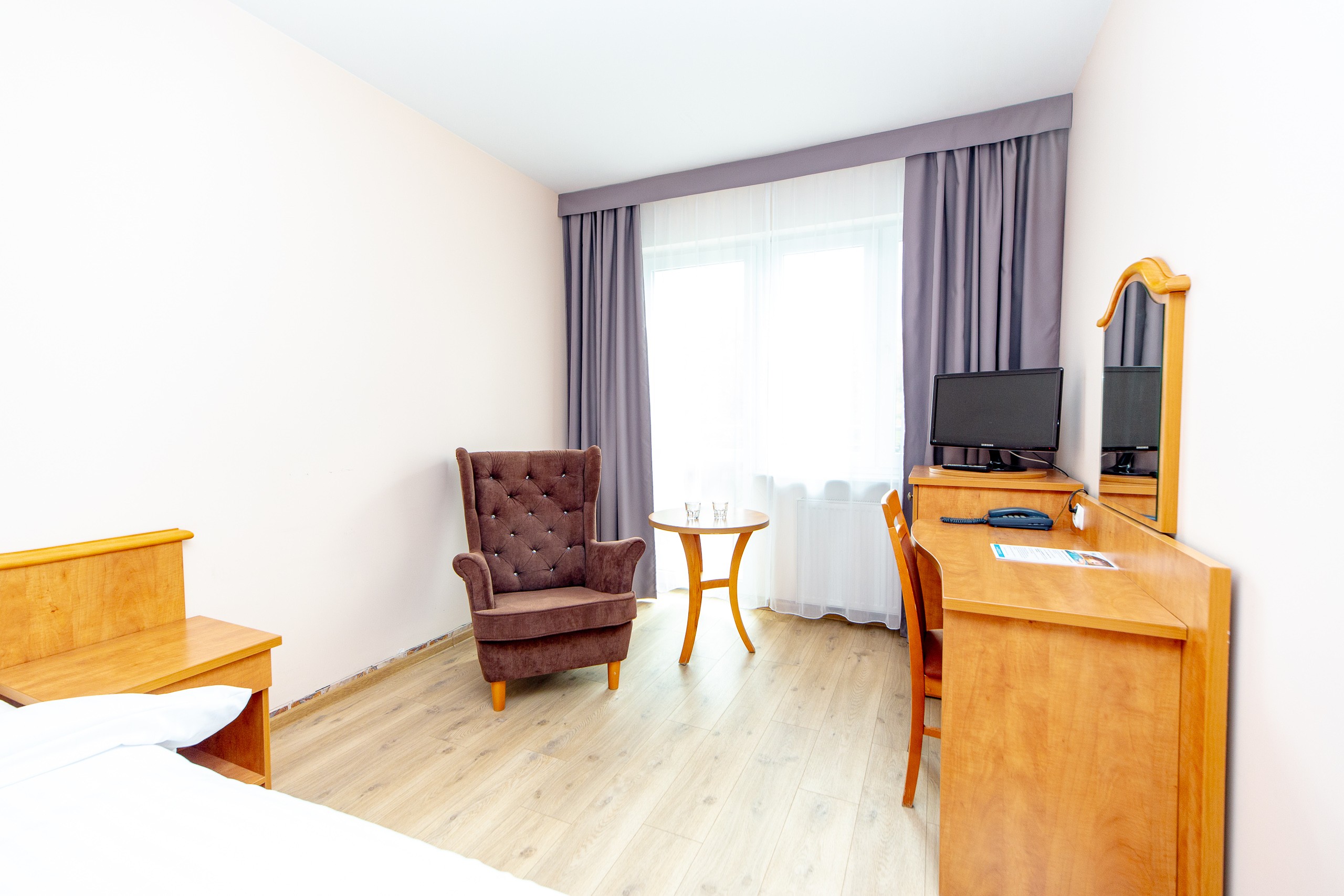 Pokój 1 osobowy Standard - ok. 14m2, łazienka, WC, suszarka, mała lodówka, telefon, TV. Możliwość rezerwacji z balkonem. Szlafrok (za opłatą 10 EUR za osobę pobyt), kapcie (za opłatą 10 EUR za osobę pobyt).