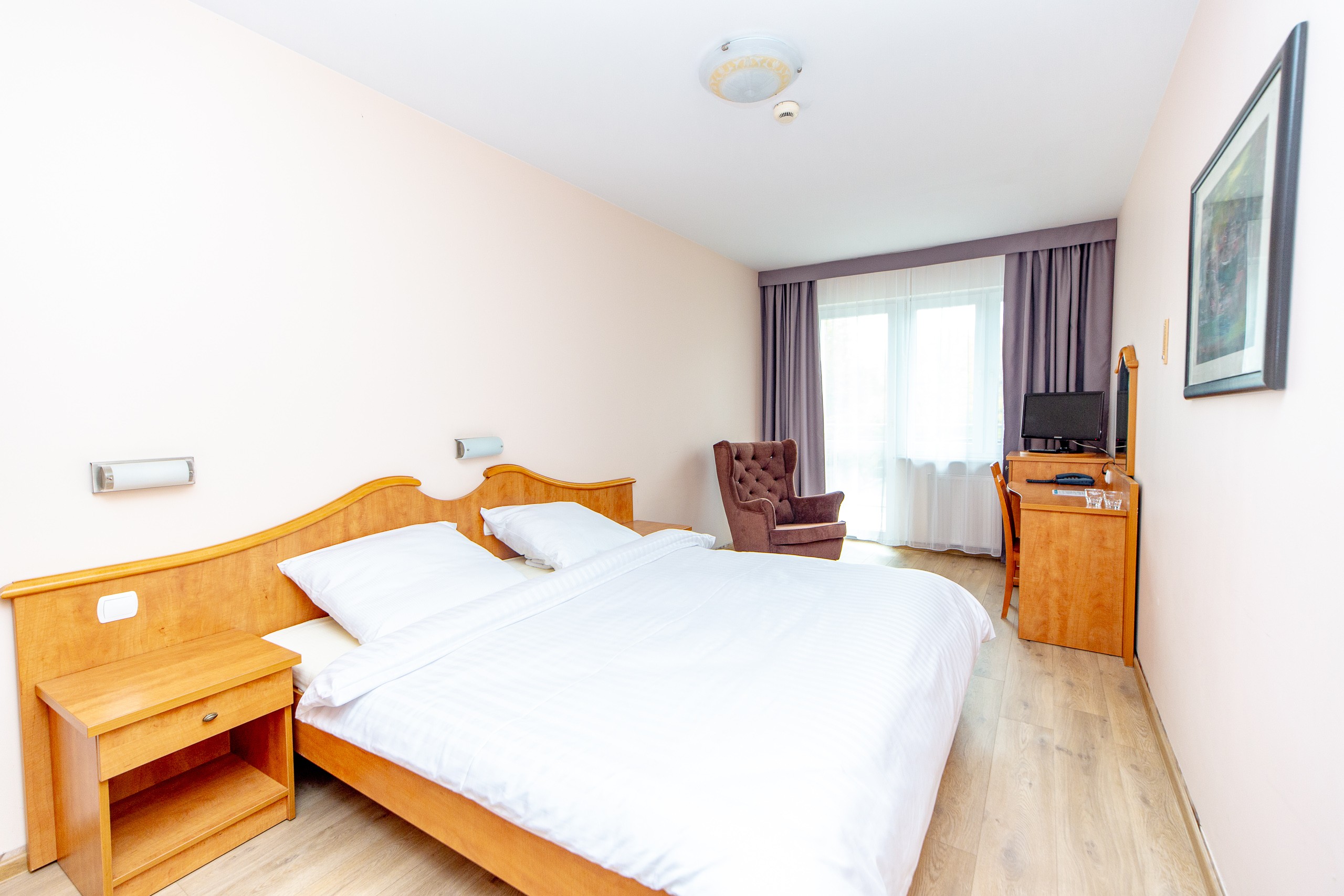 Pokój 2 osobowy Standard - ok. 16m2, łazienka, WC, suszarka, mała lodówka, telefon, TV. Szlafrok (za opłatą 10 EUR za osobę pobyt), kapcie (za opłatą 10 EUR za osobę pobyt).