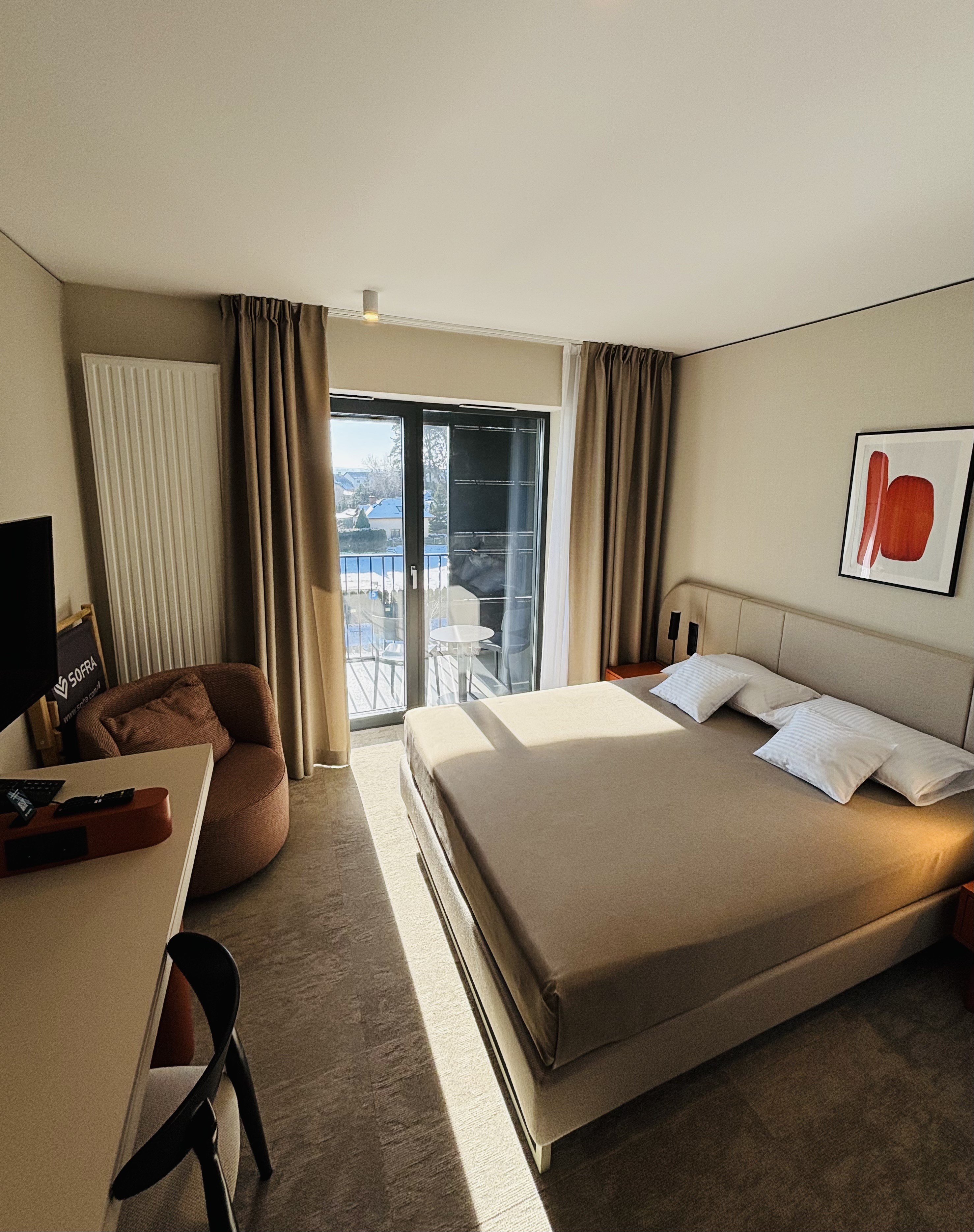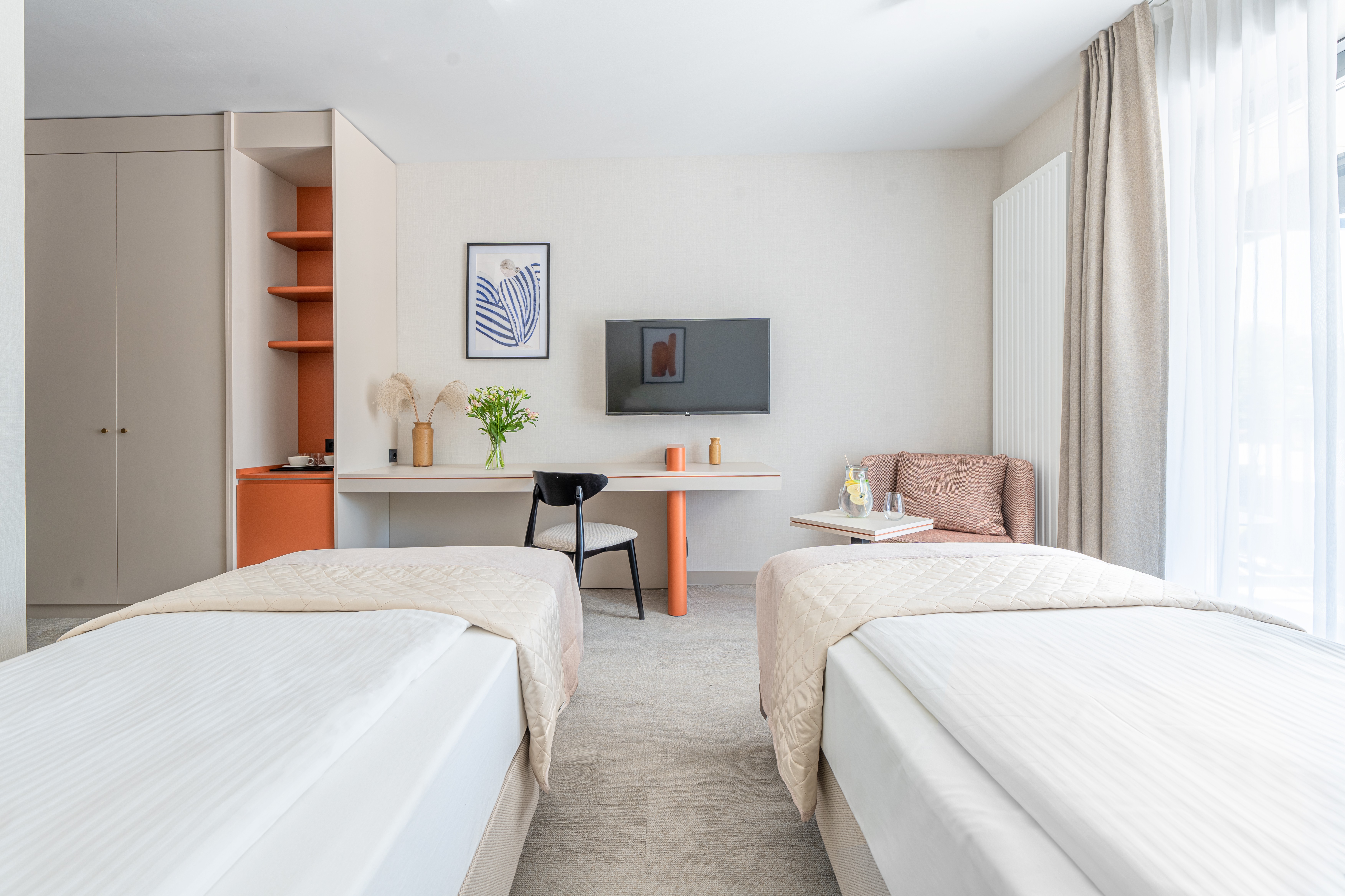 Pokój 2 osobowy Superior z balkonem - min. 24 m² sejf, balkon, czajnik, łazienka: toaleta, suszarka do włosów, prysznic, szlafrok - bezpłatnie, 2 łóżka pojedyncze, biurko, lodówka, telefon, telewizor, WIFI.
