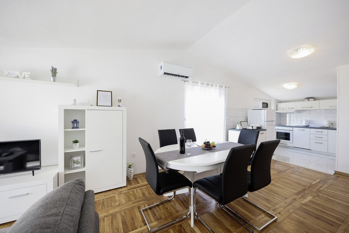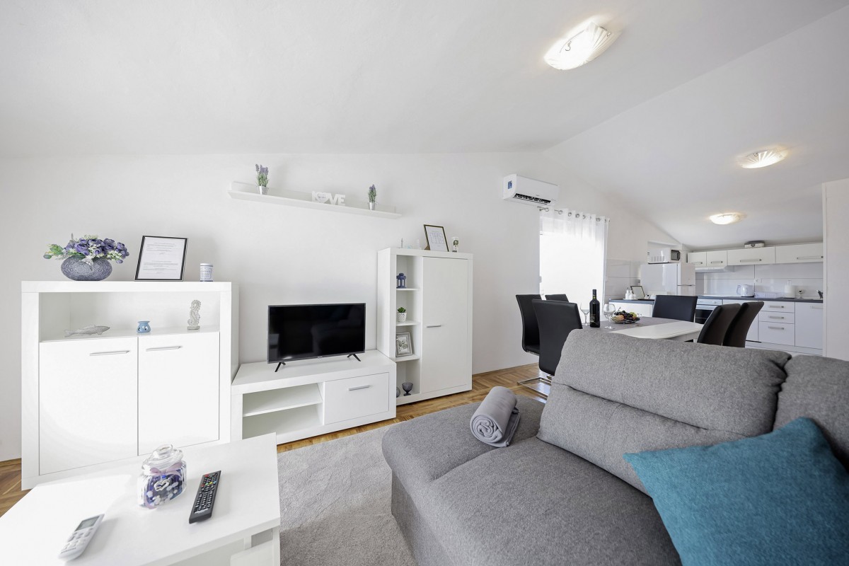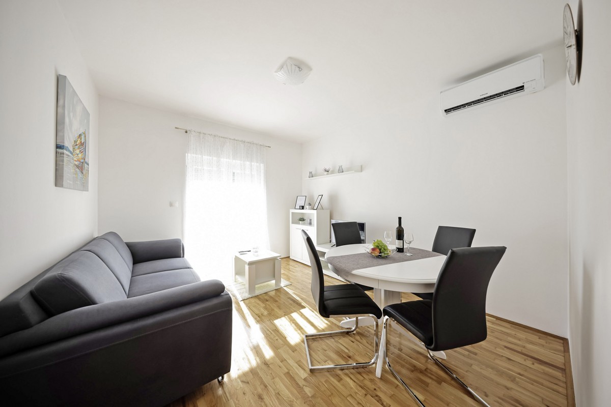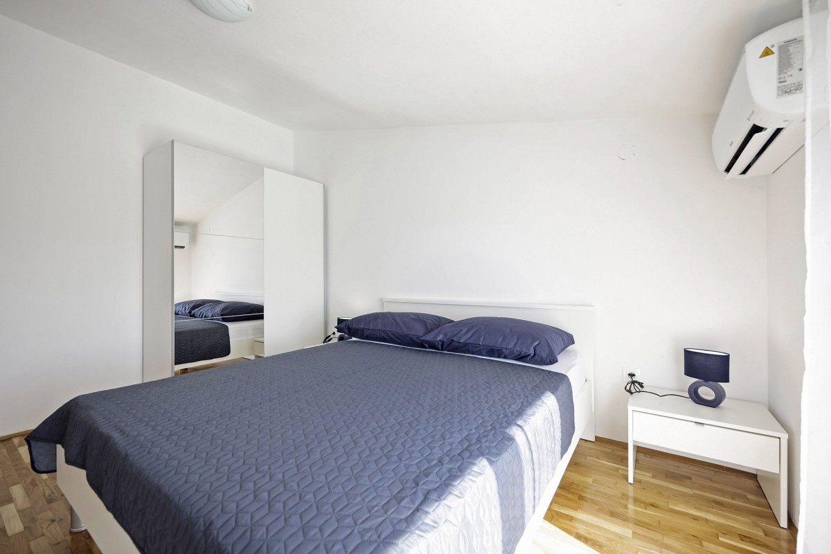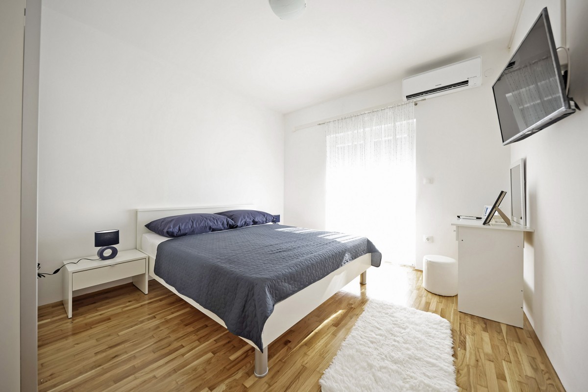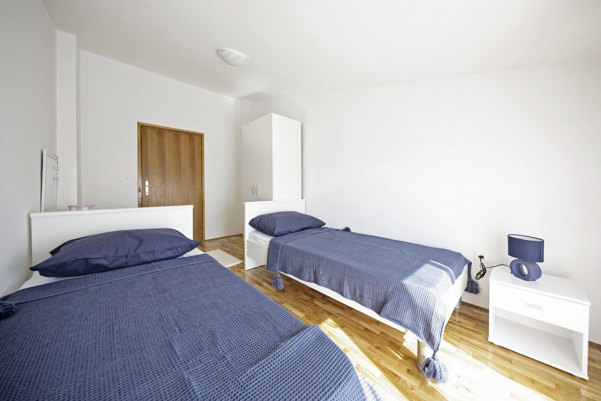 Apartament dla 4 osób AP1: ok. 95 m² na drugim piętrze, salon/jadalnia z wygodną kanapą, telewizorem i klimatyzacją, osobna kuchnia, sypialnia z łóżkiem małżeńskim i klimatyzacją i telewizorem, sypialnia z dwoma pojedynczymi łóżkami, łazienka z prysznicem i narożną wanną, oddzielne WC, balkon z widokiem na basen i morze.
