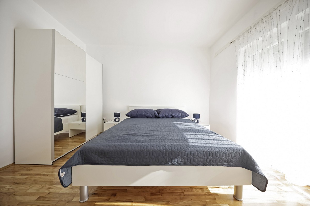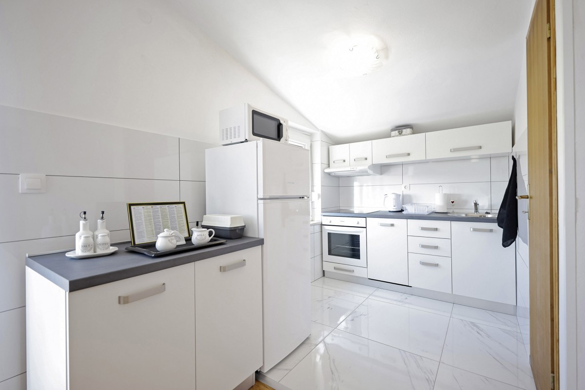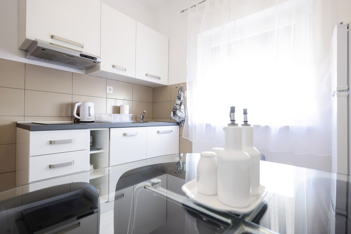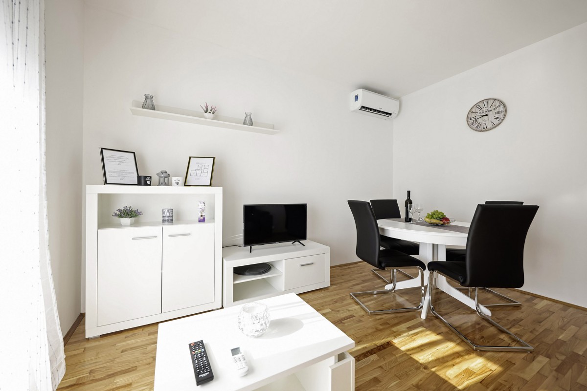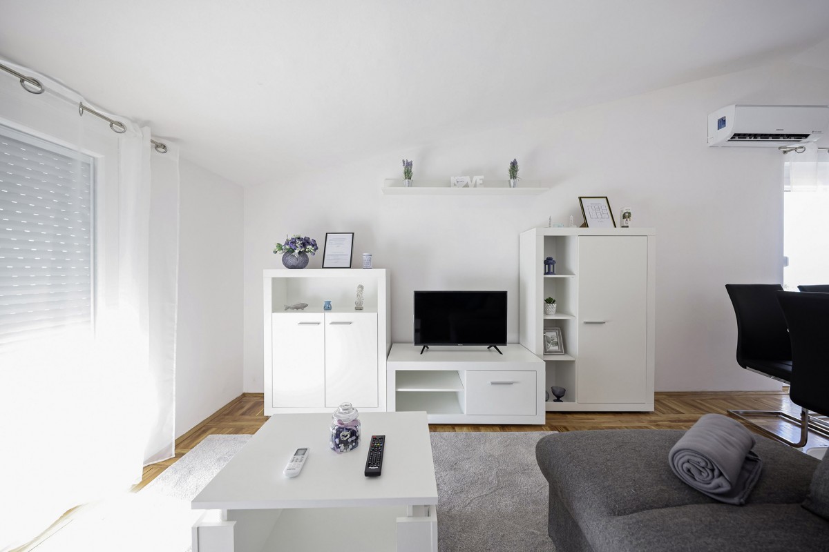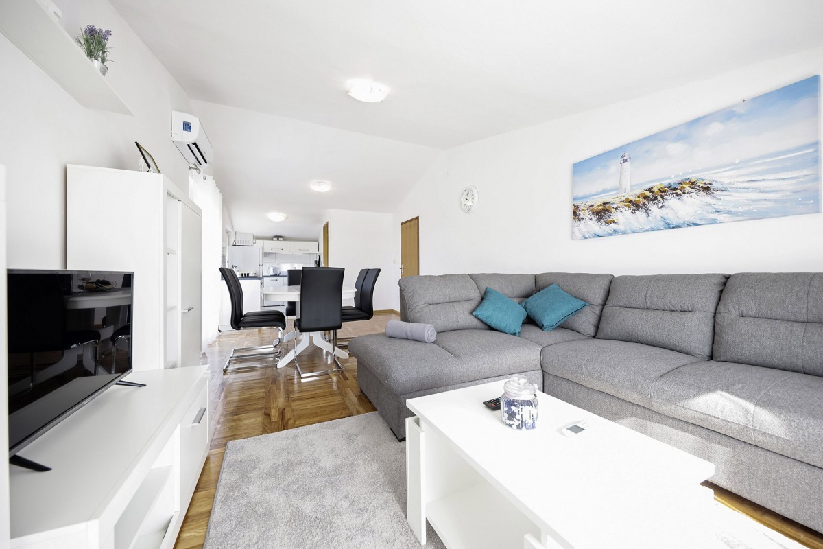 Apartament dla 4 osób AP1: ok. 95 m² na drugim piętrze, salon/jadalnia z wygodną kanapą, telewizorem i klimatyzacją, osobna kuchnia, sypialnia z łóżkiem małżeńskim i klimatyzacją i telewizorem, sypialnia z dwoma pojedynczymi łóżkami, łazienka z prysznicem i narożną wanną, oddzielne WC, balkon z widokiem na basen i morze.