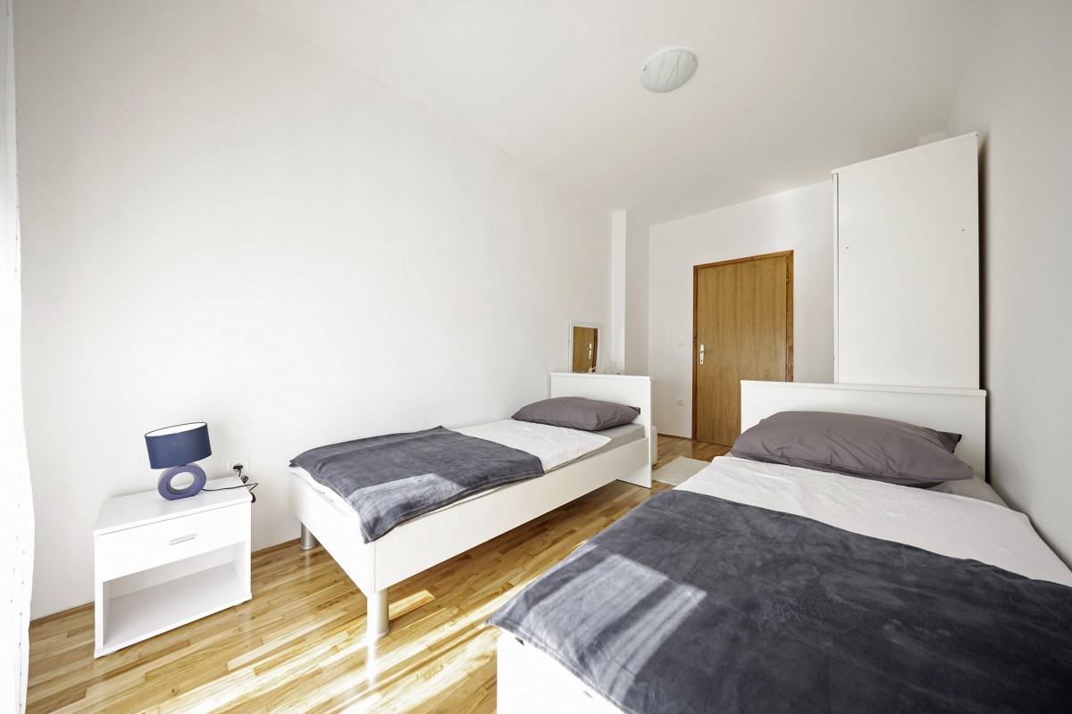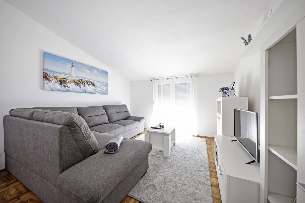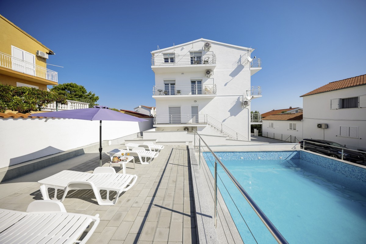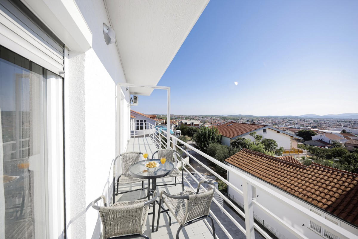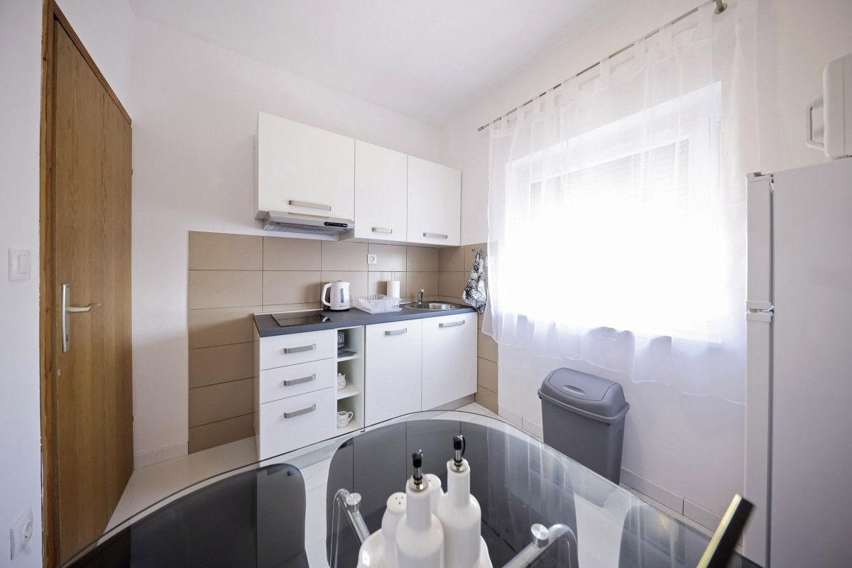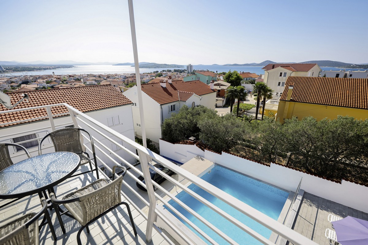 Apartament dla 4 osób AP1: ok. 95 m² na drugim piętrze, salon/jadalnia z wygodną kanapą, telewizorem i klimatyzacją, osobna kuchnia, sypialnia z łóżkiem małżeńskim i klimatyzacją i telewizorem, sypialnia z dwoma pojedynczymi łóżkami, łazienka z prysznicem i narożną wanną, oddzielne WC, balkon z widokiem na basen i morze.