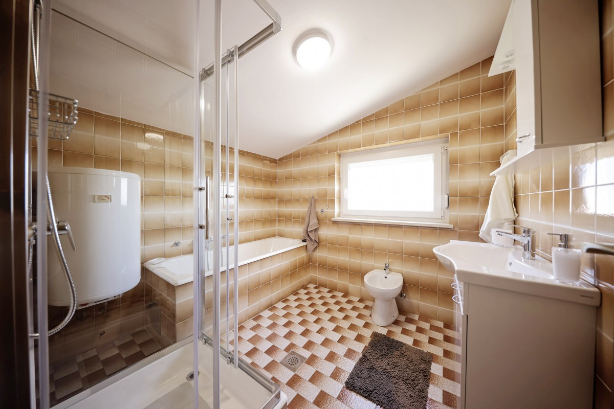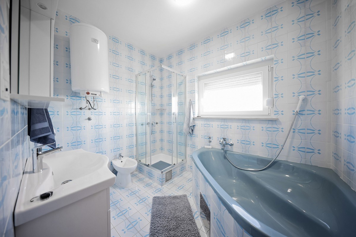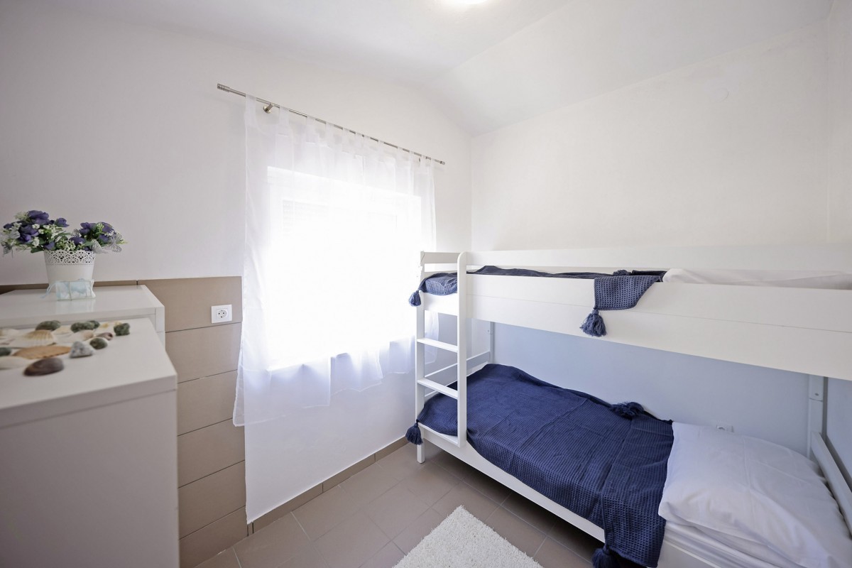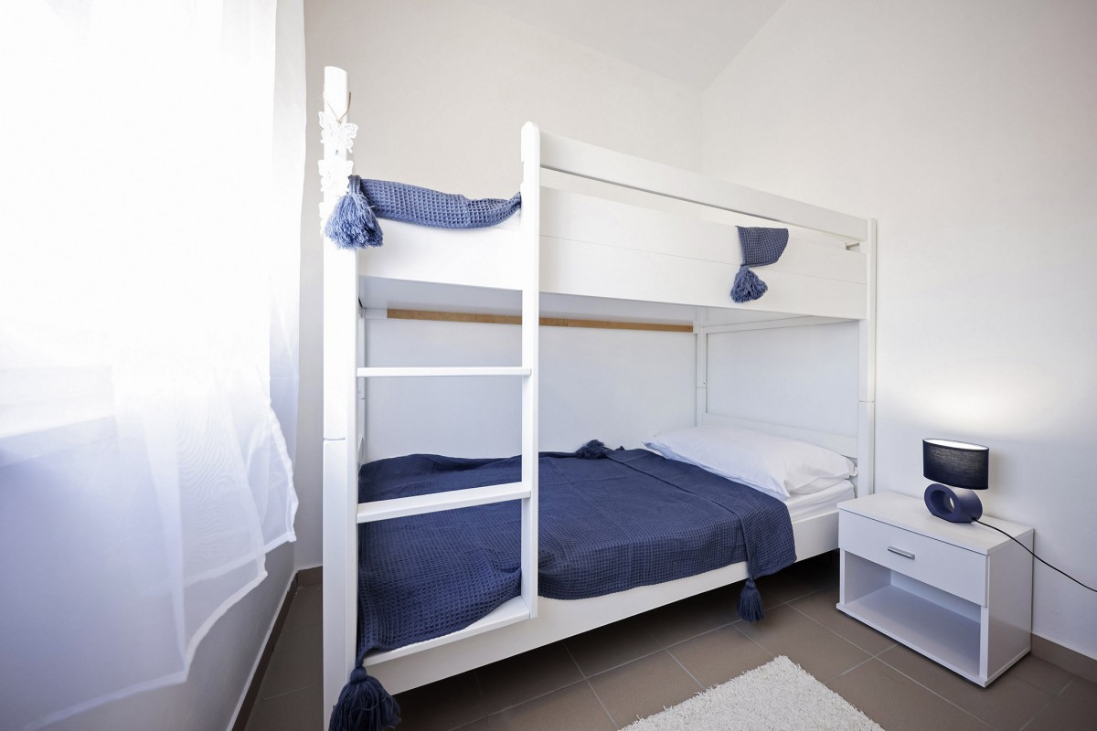 Apartament dla 6 osób AP2: ok. 110 m² na trzecim piętrze, salon/jadalnia z klimatyzacją, TV, wygodną kanapą i w pełni wyposażoną kuchnią, sypialnia z łóżkiem małżeńskim i klimatyzacją i TV, sypialnia z dwoma pojedynczymi łóżkami , sypialnia z łóżkiem piętrowym, łazienka z prysznicem i WC, łazienka z wanną i prysznicem, oddzielne WC, dwa balkony z widokiem na basen i morze.