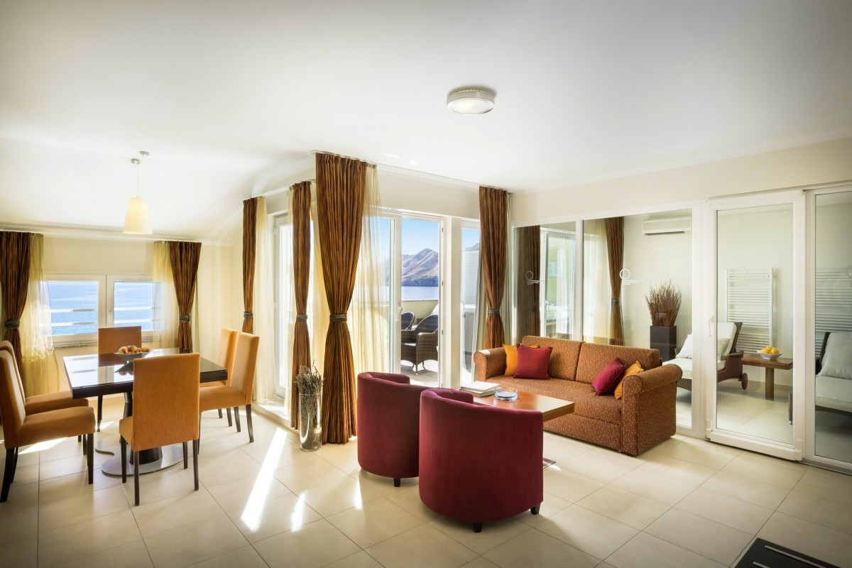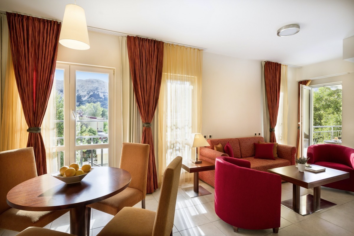 36 pokoi****: łóżko małżeńskie lub dwa łóżka pojedyncze, rozkładana sofa dla jednej osoby, telewizor LCD, klimatyzacja, telefon, bezpłatne WiFi, sejf, minibar (uzupełniany na życzenie), łazienka/WC. Łóżeczko dziecięce dostępne na życzenie (za opłatą, 5 € za dzień).Pokój dwuosobowy ****: ok. 30 m², położony po spokojniejszej stronie parku.Pokój dwuosobowy z balkonem ****: ok. 26-35 m², z balkonem wychodzącym na cichszą stronę parku.Apartament dla 2-4 osób ****: ok. 47-60 m², telewizor LCD, klimatyzacja, telefon, bezpłatne WiFi, sejf, jedna sypialnia dwuosobowa, pokój dzienny z rozkładaną sofą, aneks kuchenny z kuchenką, lodówką i mikrofalówką, jadalnia, łazienka/WC, balkon od strony spokojniejszego parku.Apartament Superior dla 2-4 osób *****: ok. 55-62 m², telewizor LCD, klimatyzacja, telefon, bezpłatne WiFi, sejf, jedna sypialnia dwuosobowa, pokój dzienny z rozkładaną sofą, aneks kuchenny z kuchenką, lodówką i mikrofalówką, jadalnia, prysznic/WC, wanna/WC, balkon z widokiem na morze.Luksusowy apartament dla 4-6 osób *****: ok. 110 m², telewizor LCD, klimatyzacja, telefon, bezpłatne WiFi, sejf, dwie sypialnie, każda z własną łazienką (prysznic/WC i wanna/WC), salon z kanapą, część jadalna, aneks kuchenny z kuchenką, lodówką i mikrofalówką, dodatkowa toaleta, duży balkon z prywatnym jacuzzi, sauną, leżakami i widokiem na morze.