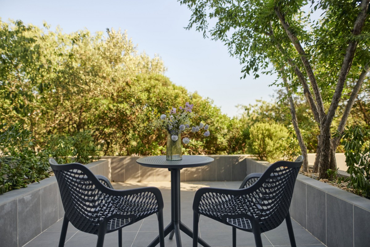 Pokój dwuosobowy z tarasem: ok. 20 m², z umeblowanym tarasem z widokiem na morze.