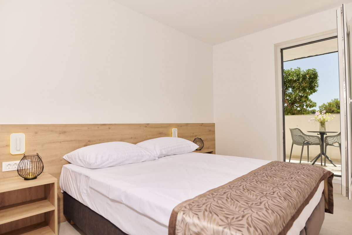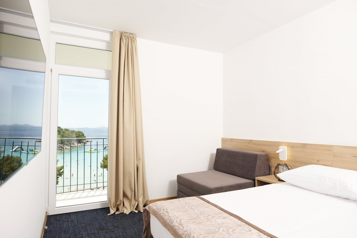 Pokój dwuosobowy z balkonem: ok. 20 m², z rozkładaną sofą (90x200 cm), umeblowanym balkonem z widokiem na morze.